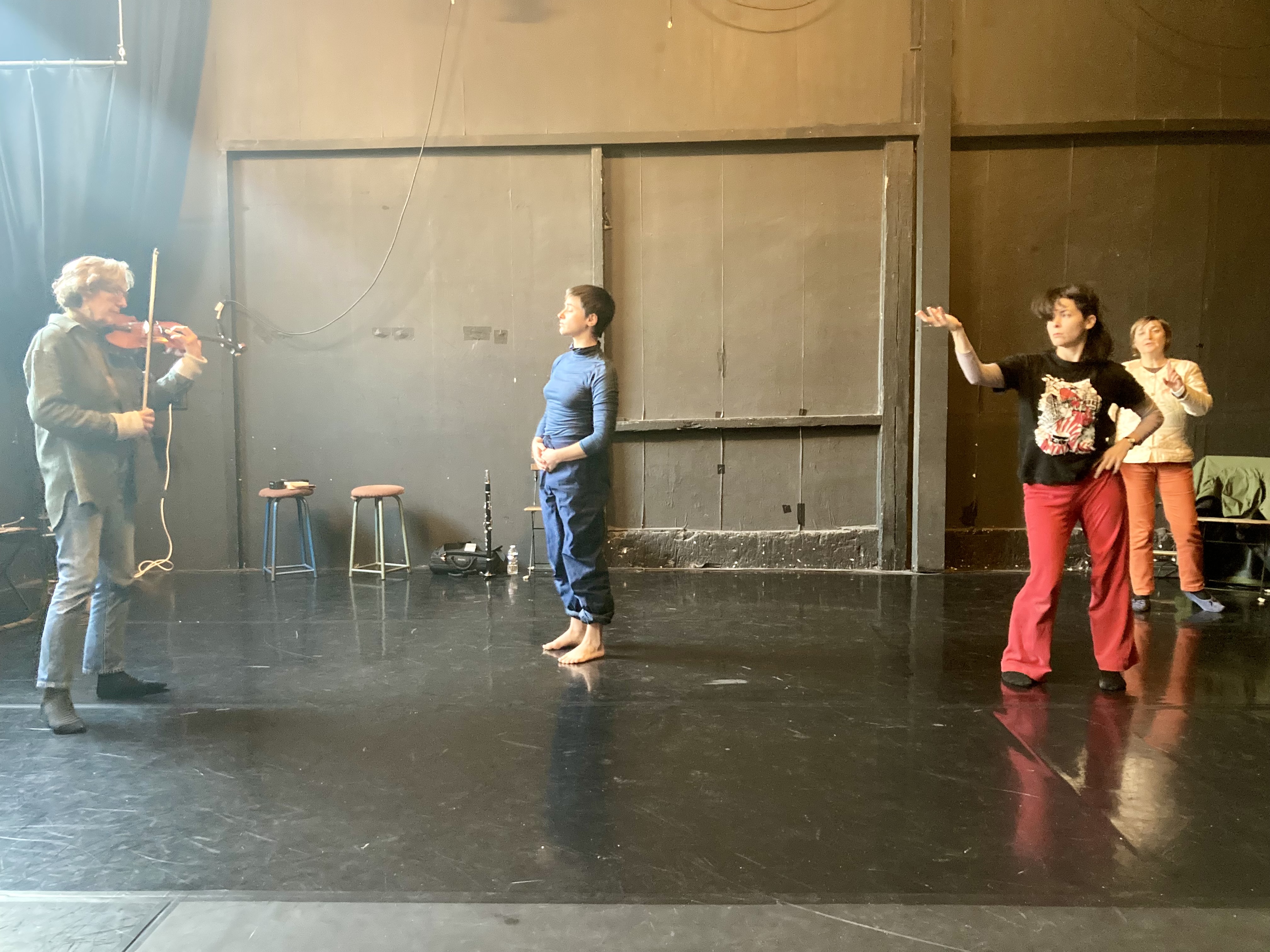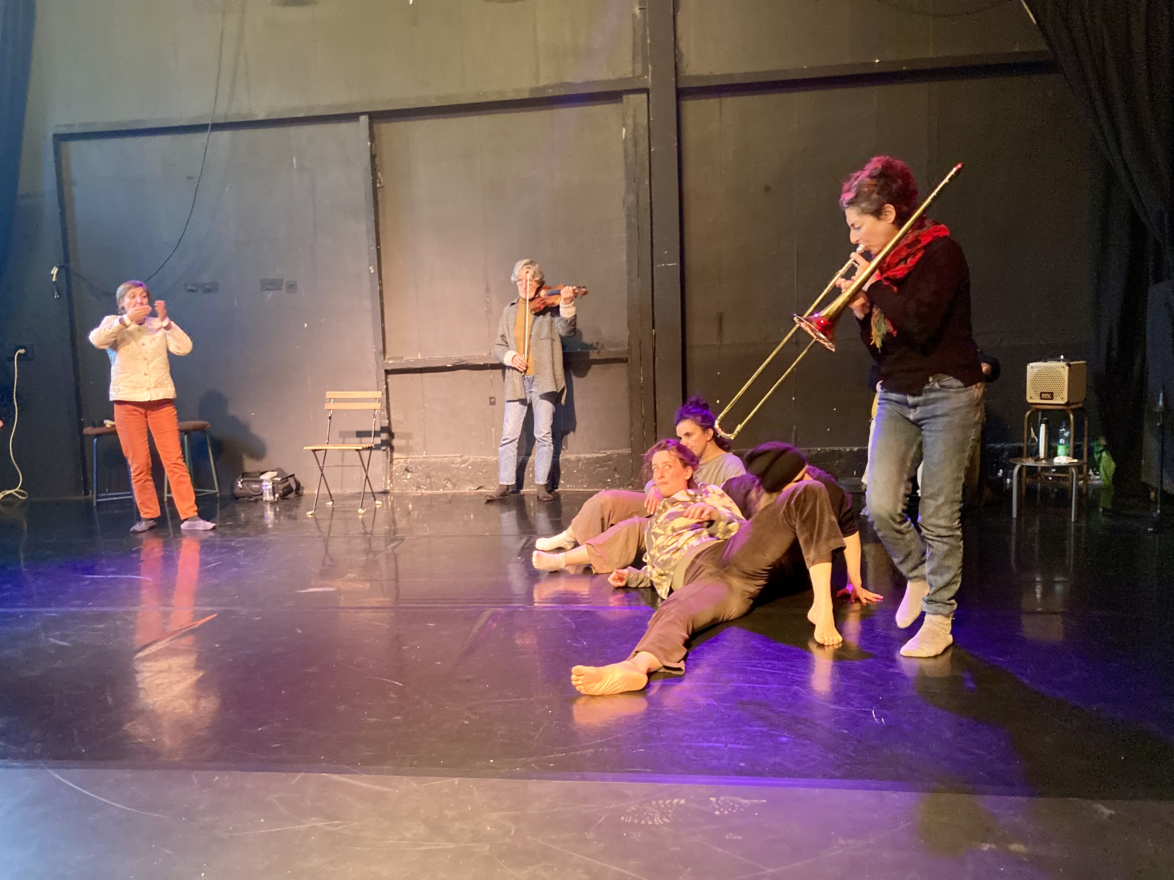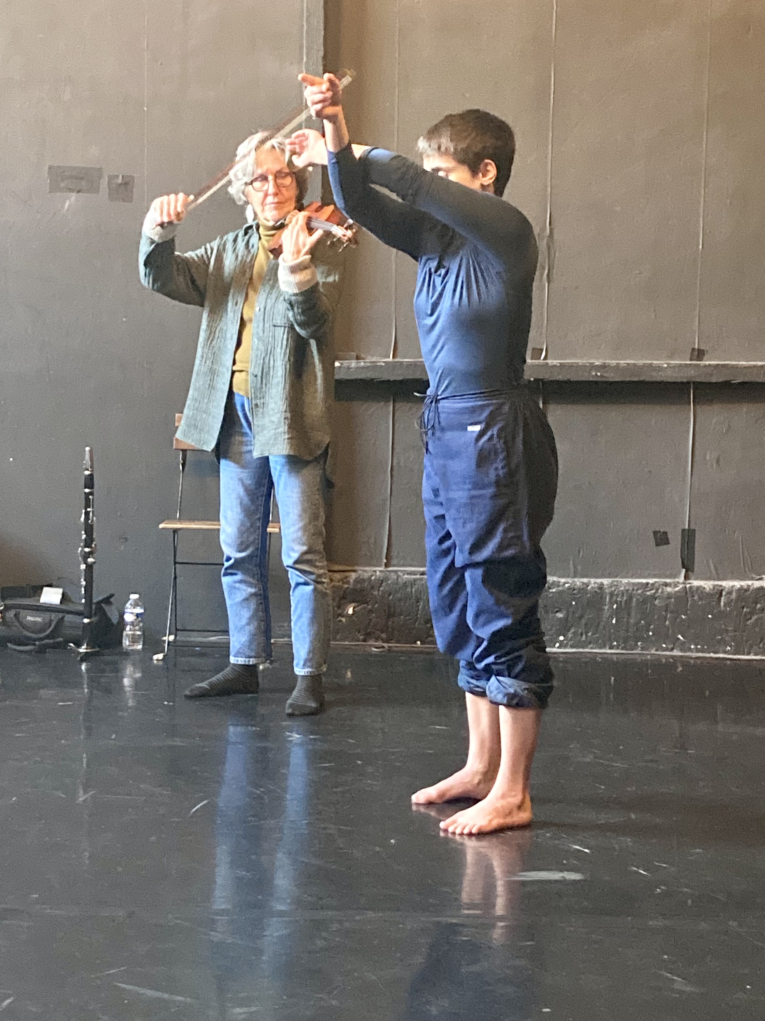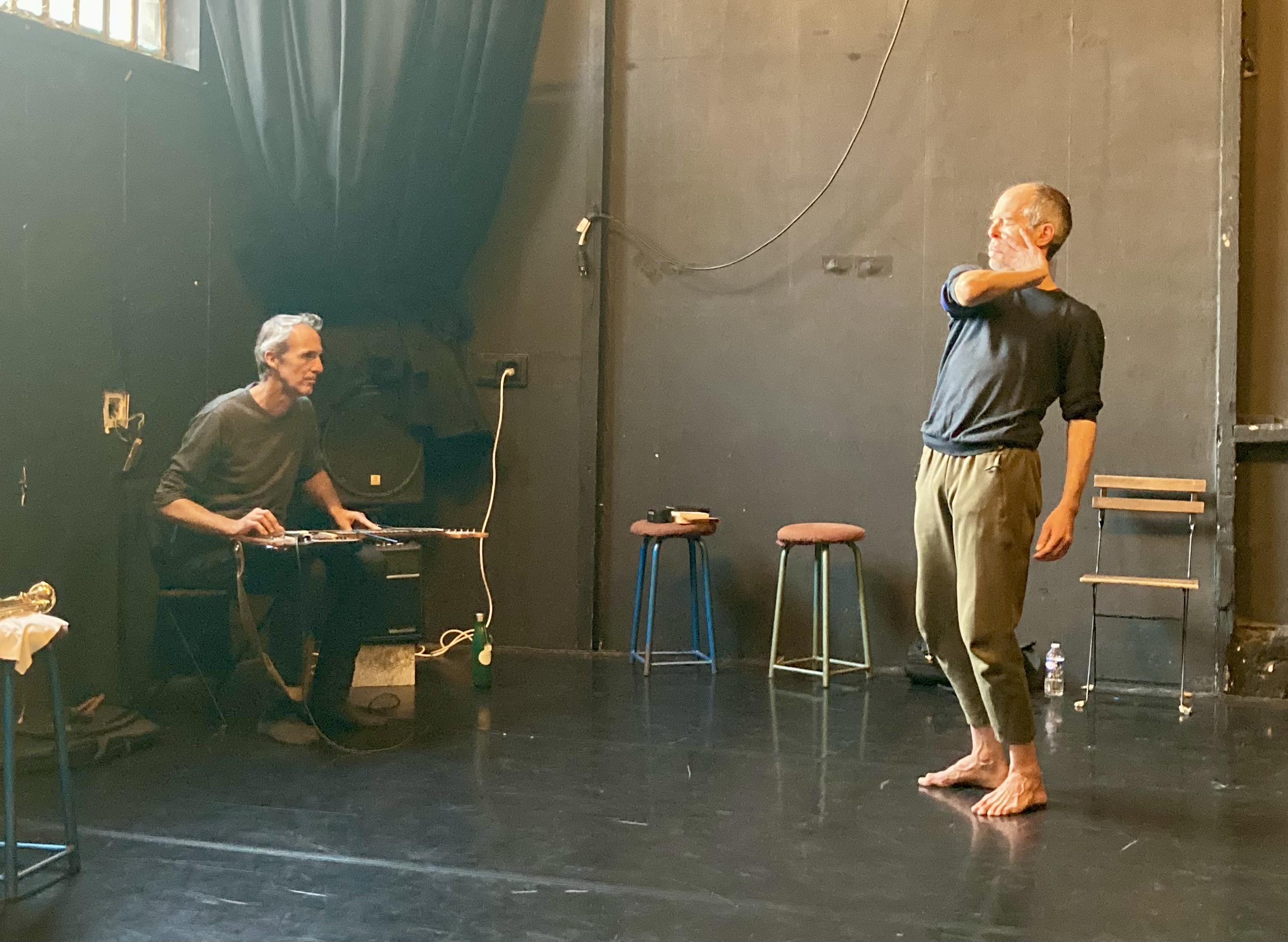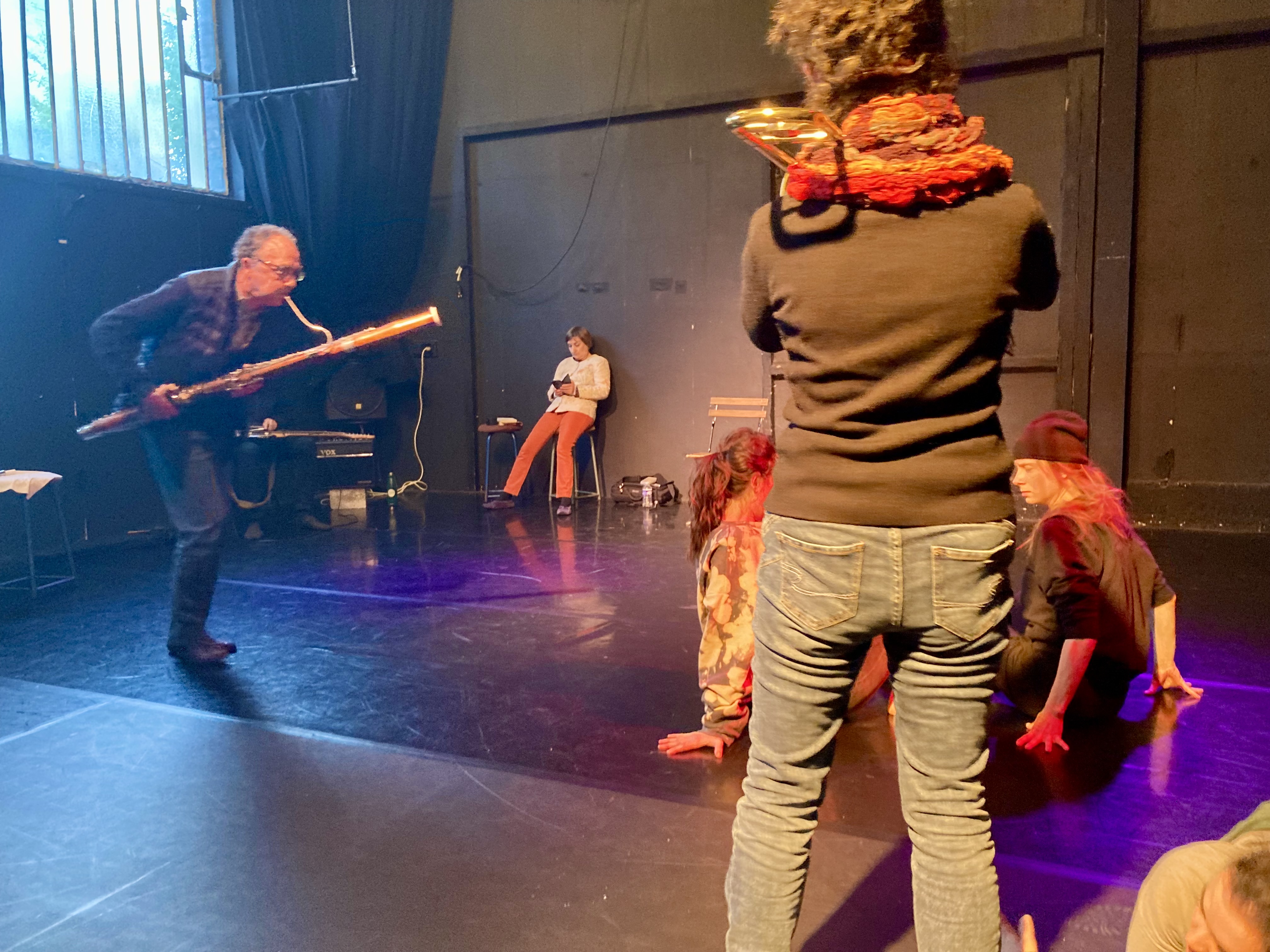 Restitution publique de la journée de travail danse/musique improvisées proposée par Marguerite Papazoglou (danse) et Jean-Sébastien Mariage (musique).