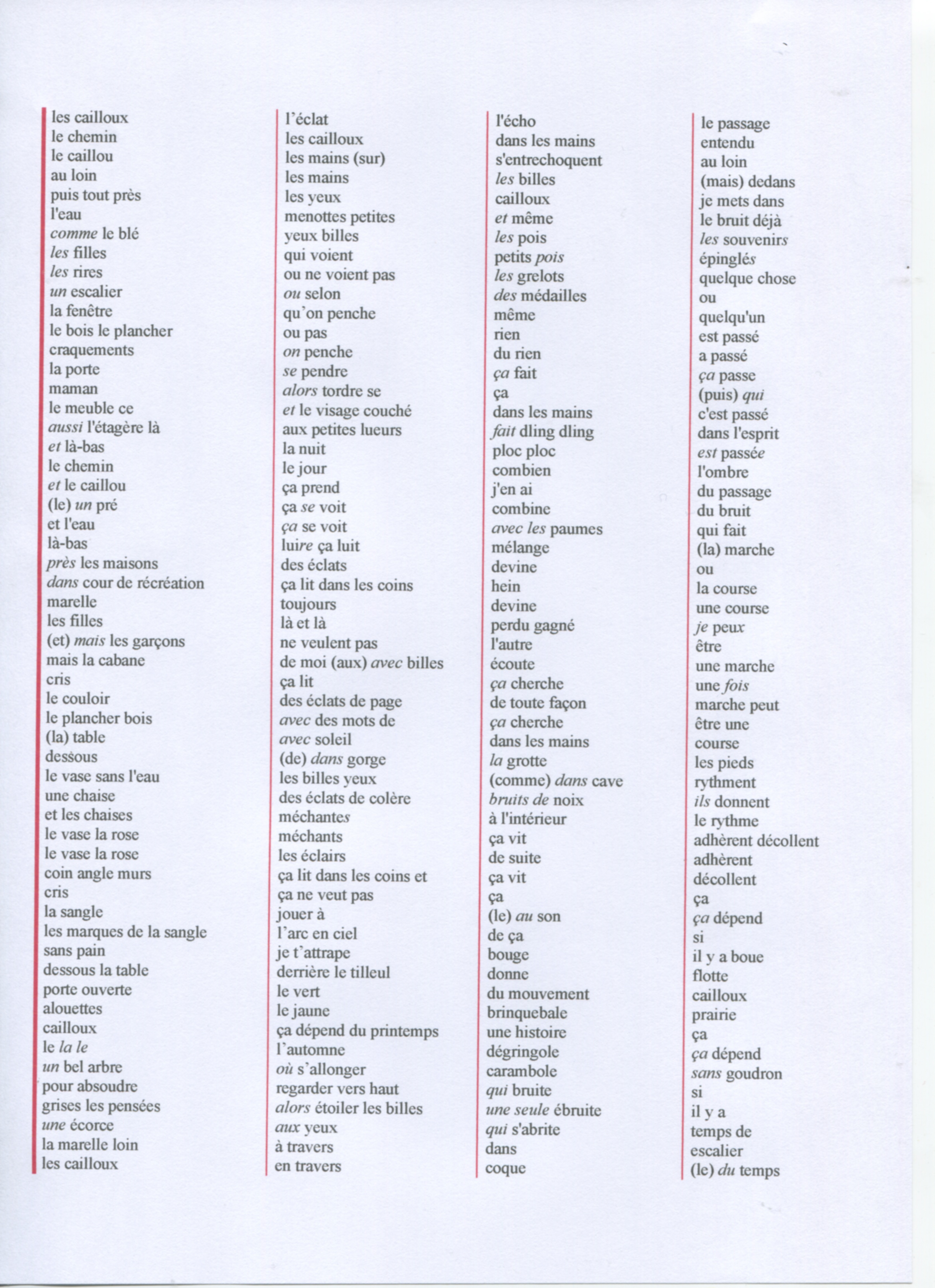 Une autre version comprend quatre colonnes de texte filant également sur cinquante page. La thématique de la seconde colonne est liée à la lumière, aux couleurs ; la troisième est liée aux sons, bruits, voix ; la quatrième aux mouvements, à la vitesse, la lenteur... c’est Les quatre colonnes.