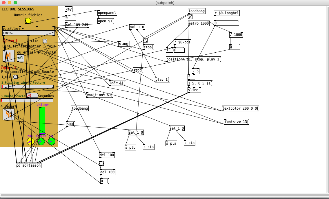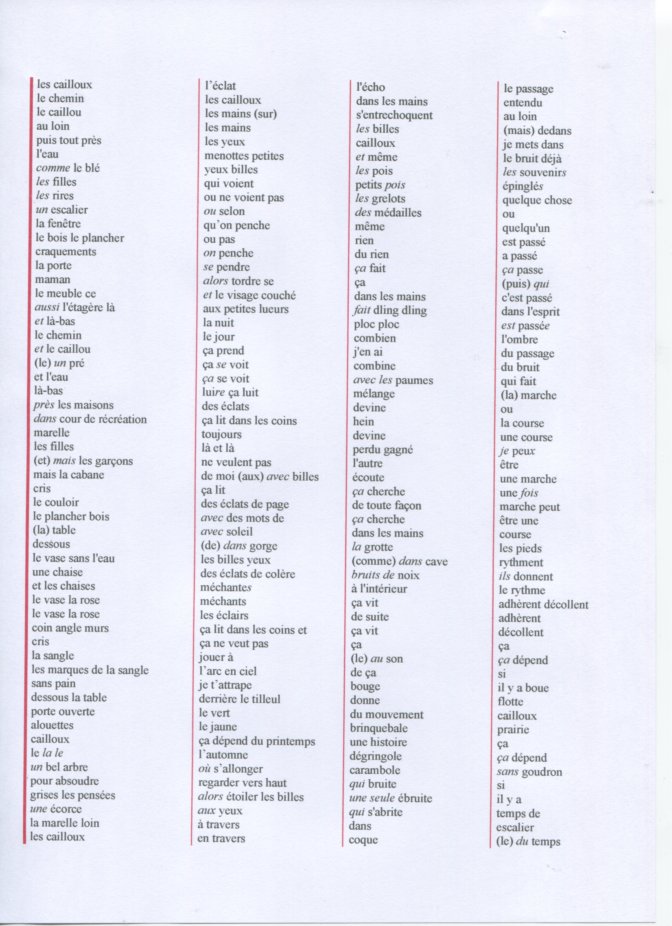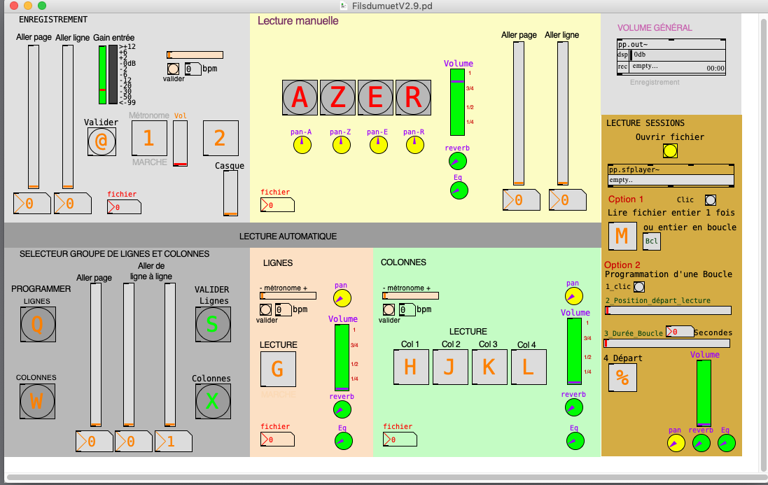 Les premiers enregistrements de ma voix du texte (plusieurs dizaines de pages) permettent d’engranger plusieurs milliers de fichiers sons, chacun contenant quelques mots. Ils correspondraient, si l’on rentrait le texte (dans sa version à quatre colonnes) dans un tableau, aux cellules de celui-ci. La programmation me permet de sélectionner et de choisir rapidement la page du texte et le fichier son que je veux faire entendre, me permettant ainsi de manipuler rapidement les pages, les colonnes, les lignes. Je peux donc jouer sur la succession des cellules, donc des mots, les agencer comme je le désire, ainsi que sur la vitesse de lecture, et les effets de panoramiques, réverbération, etc. Je peux jouer avec la lecture en lignes, en colonnes. Je peux mixer plusieurs sessions en les superposant.