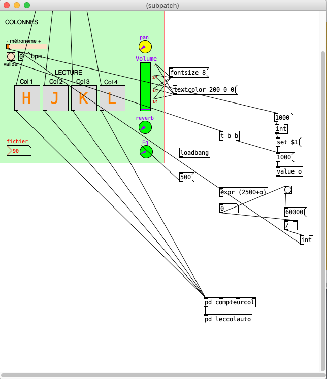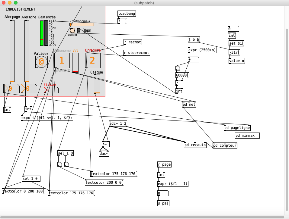 Lorsque Michel Gendarme rencontre Maurice Moncozet, musicien, chanteur et compositeur, il lui expose son souhait de pouvoir manipuler en live directement des enregistrements du texte avec sa voix. Maurice lui propose de mettre au point une première programmation à partir du logiciel libre Pure Data. C’est ainsi que débute leur collaboration, qui se poursuit, Maurice travaille sans relâche à des adaptations ainsi qu’à de nouvelles versions de la programmation initiale, répondant ainsi aux recherches de nouvelles fonctionnalités. Les premiers enregistrements du texte avec la voix de l’auteur (plusieurs dizaines de pages) permettent d’engranger plusieurs milliers de fichiers sons, chacun contenant quelques mots. Ils correspondraient, si l’on rentrait le texte (dans la version Les quatre colonnes) dans un tableau, aux cellules de celui-ci. La programmation permet de sélectionner et de choisir rapidement la page du texte et le fichier son à faire entendre, permettant ainsi de manipuler rapidement les pages, les colonnes, les lignes. On peut donc jouer sur la succession des cellules, donc des mots, les agencer comme on le désire, ainsi que sur la vitesse de lecture, et les effets de panoramiques etc.