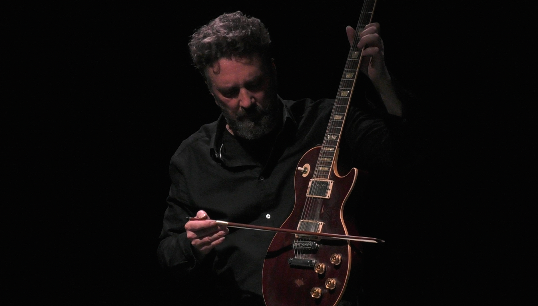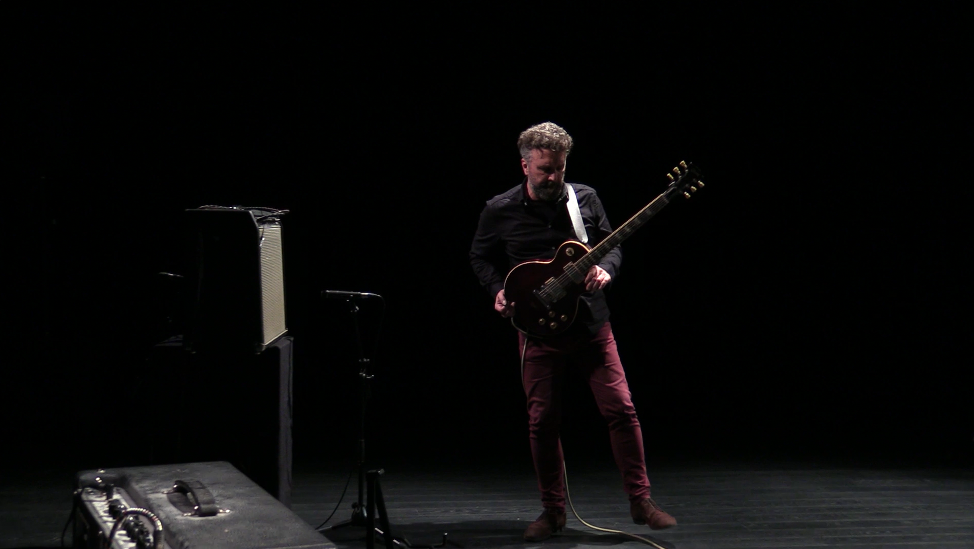 Feedback. Sounds are launched from the amplifier to the guitar, where they bounce back to their source. The strings of the guitar weave a web which reveals a sound horizon whose reliefs are drawn by the fluctuations of the electric matter. Far from control or mastery, the musician here brings into play a most simplistic device that he pushes to the extreme, wandering around the amplifier, like a dance that destabilizes the waves.